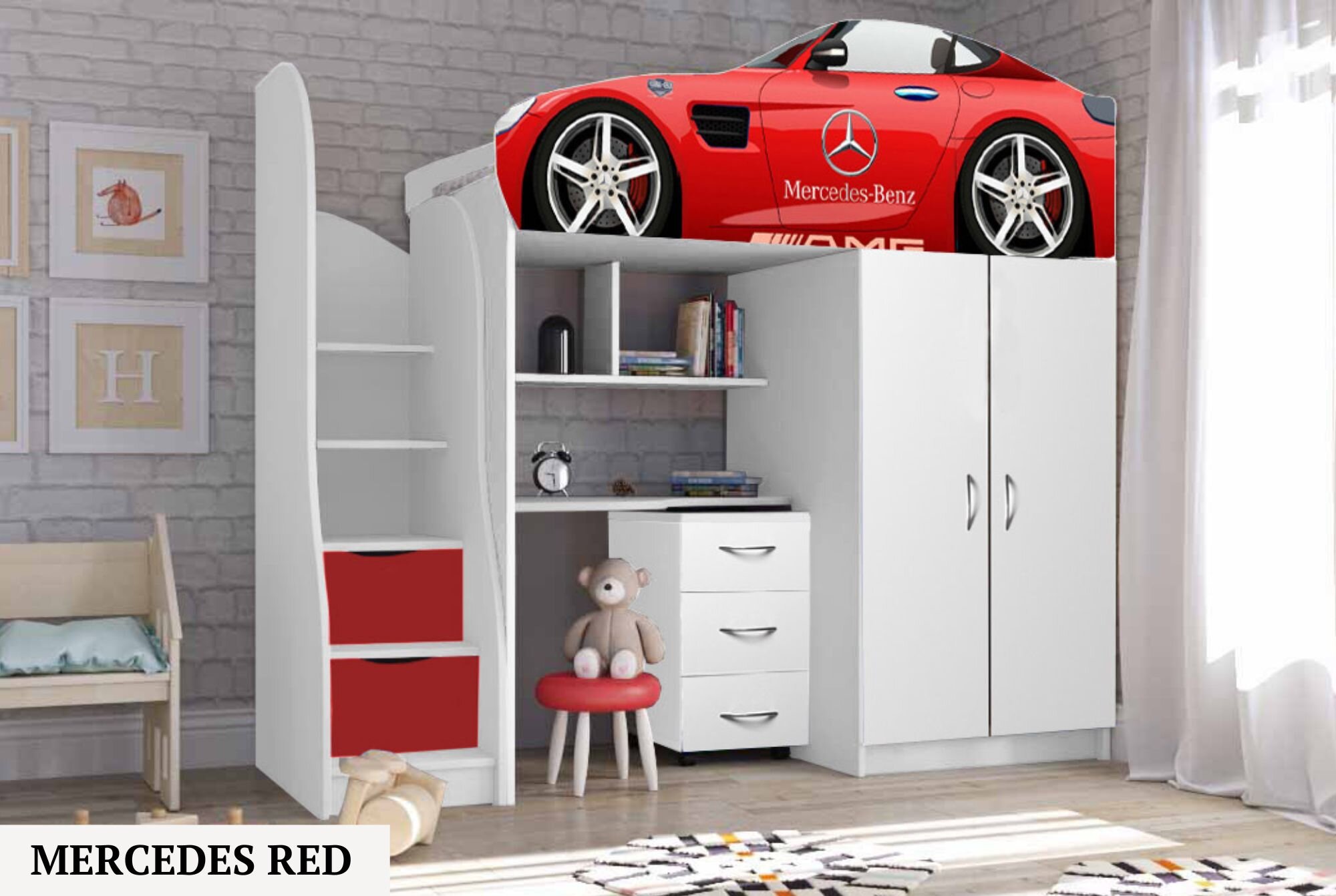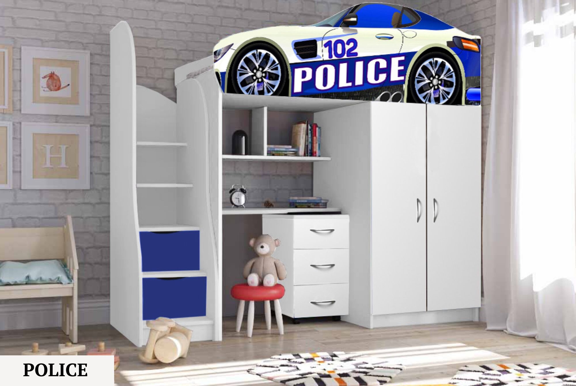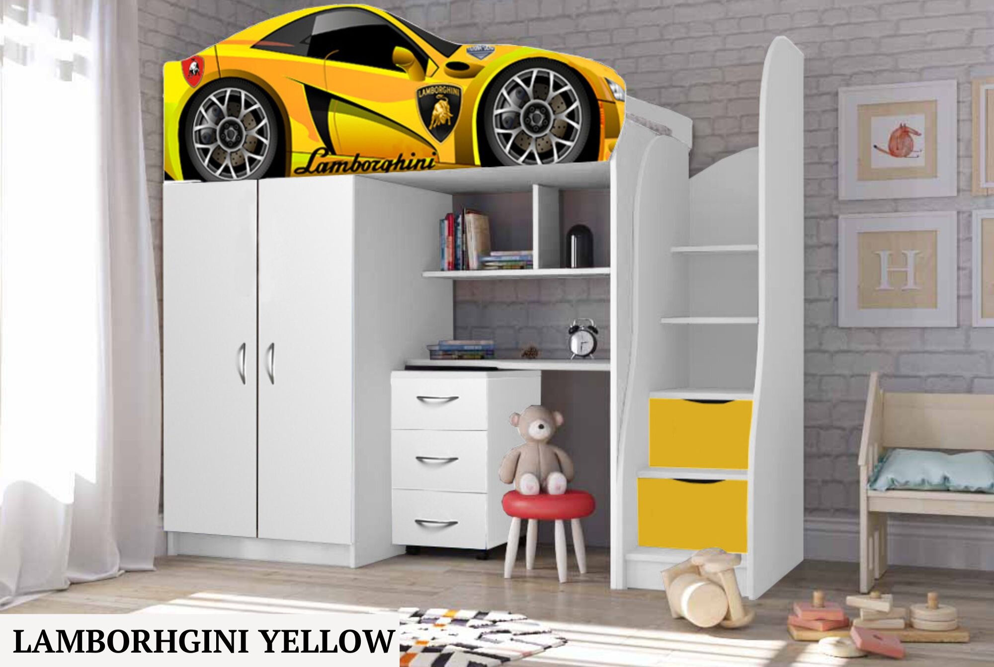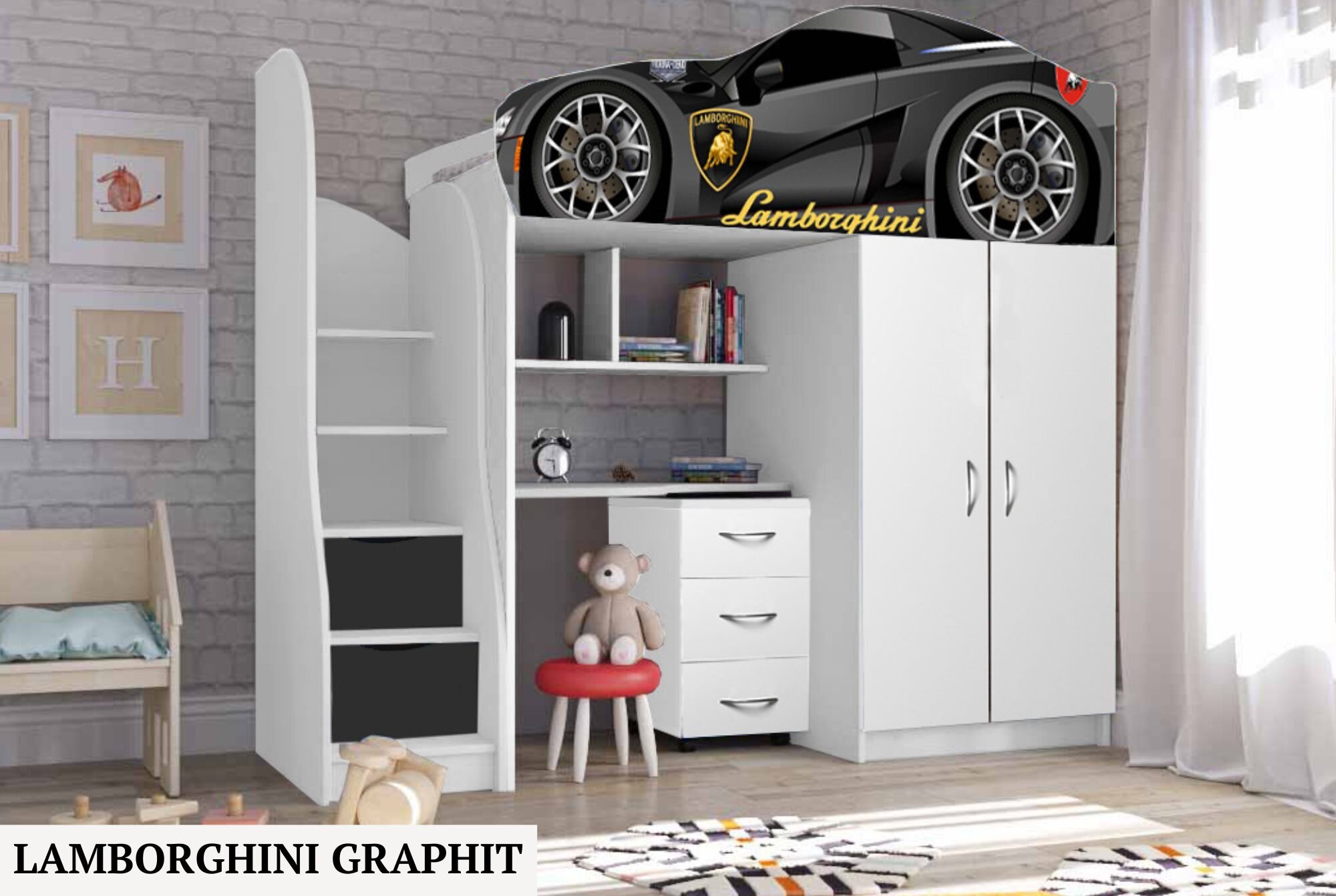 Нижній ярус ліжка складається із шафи, настінних поличок, поличок сходів, виїзного комоду.