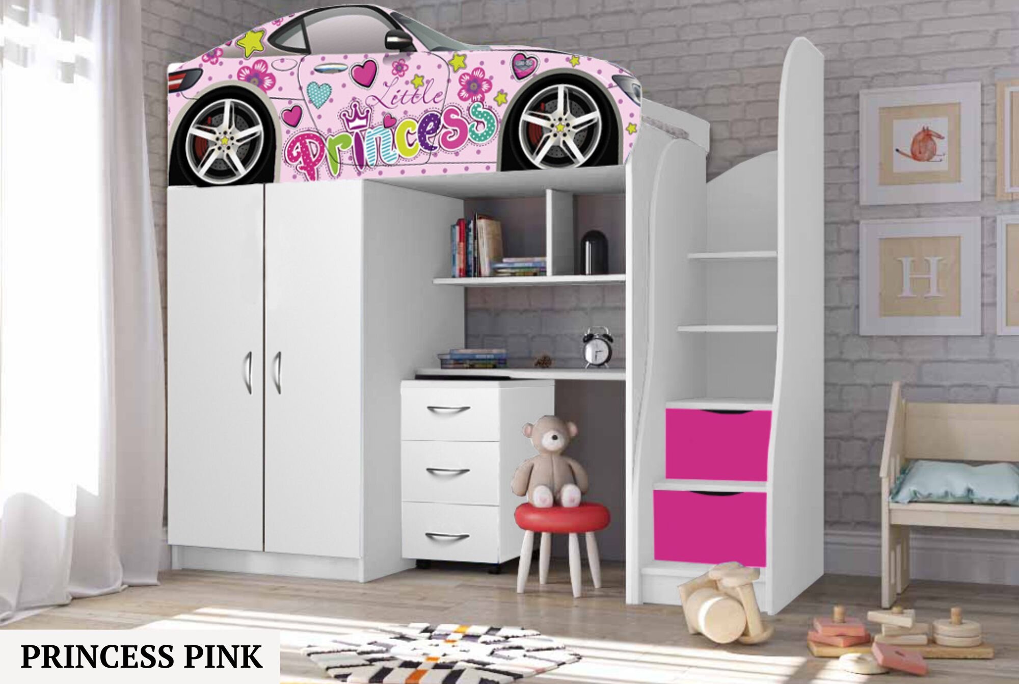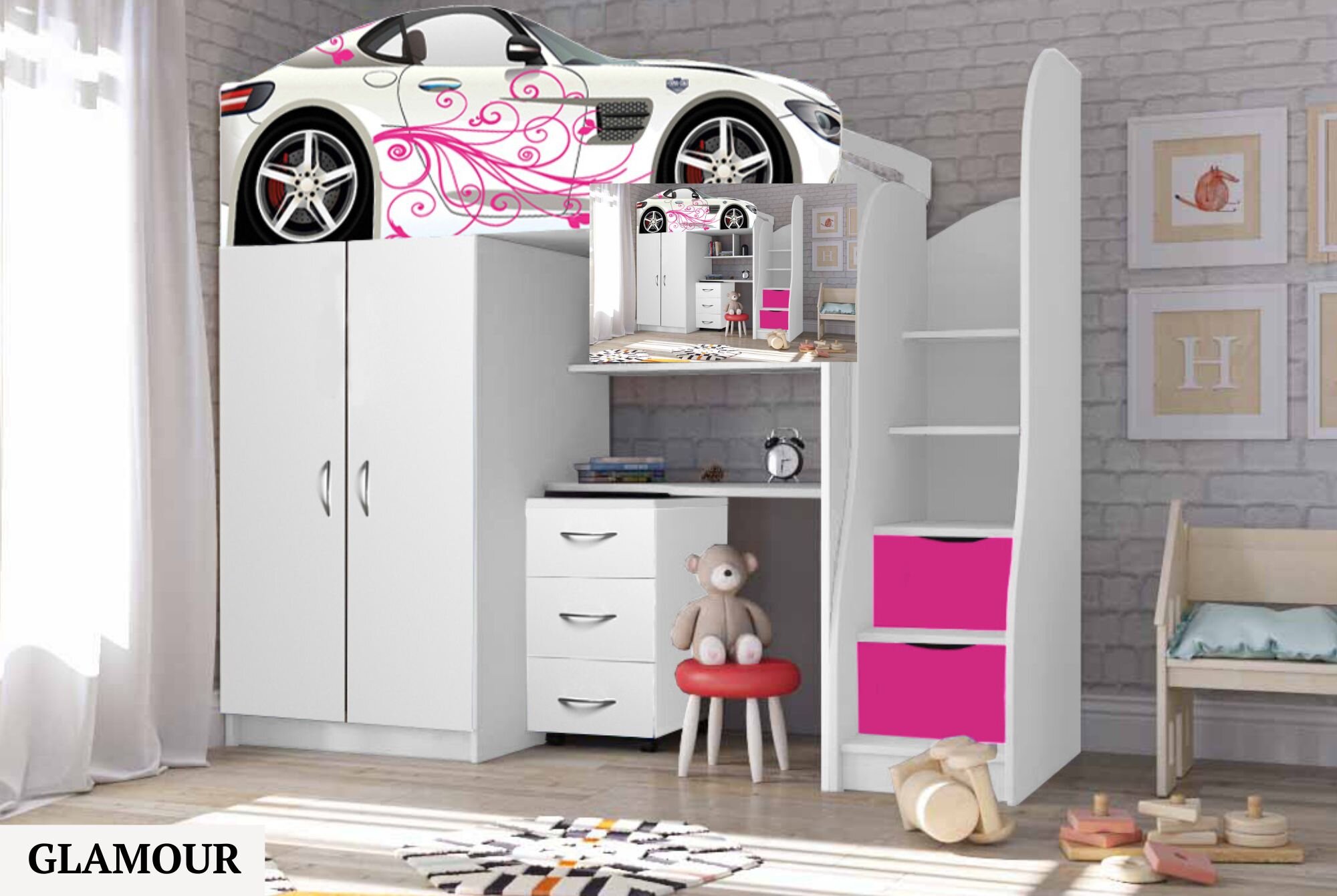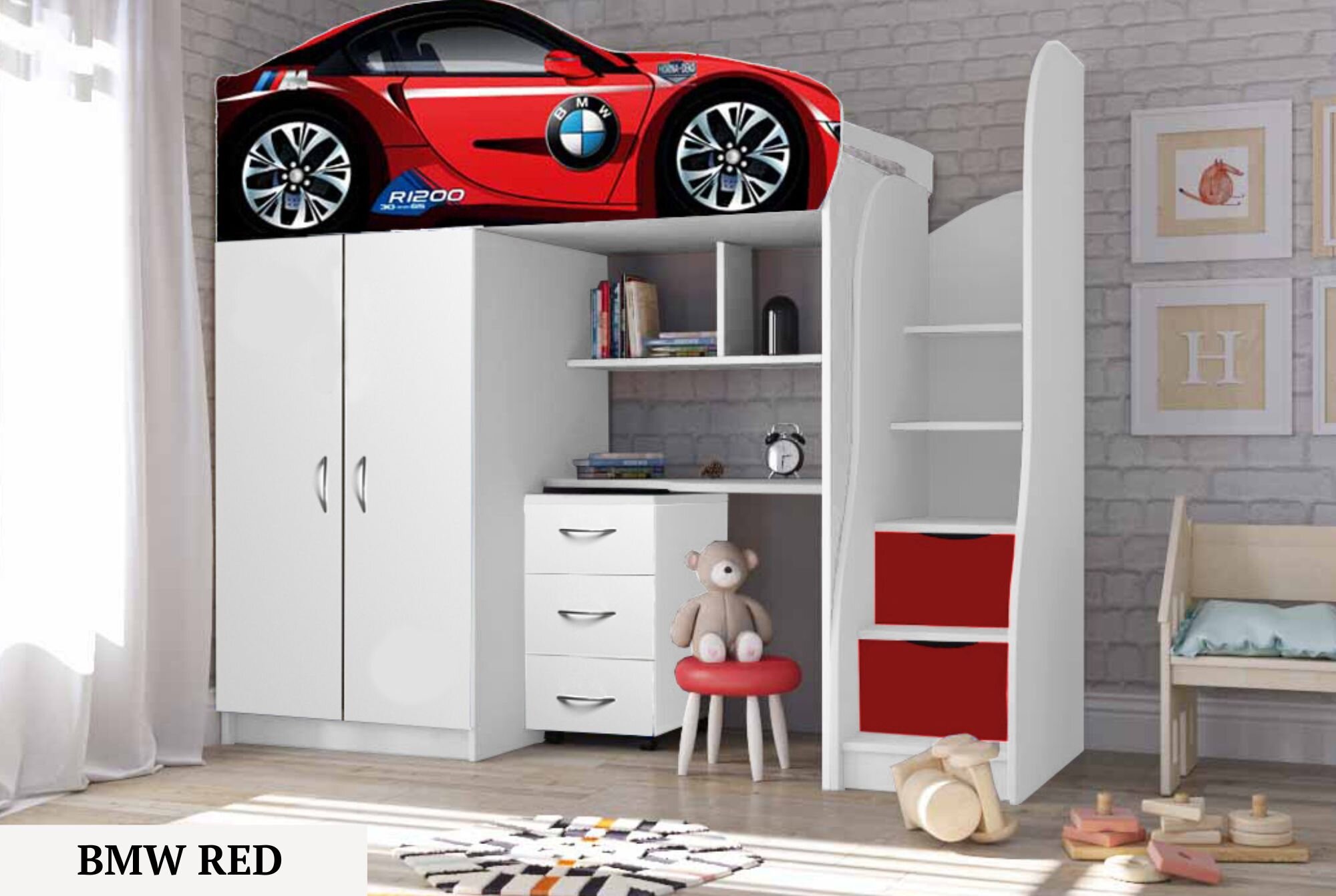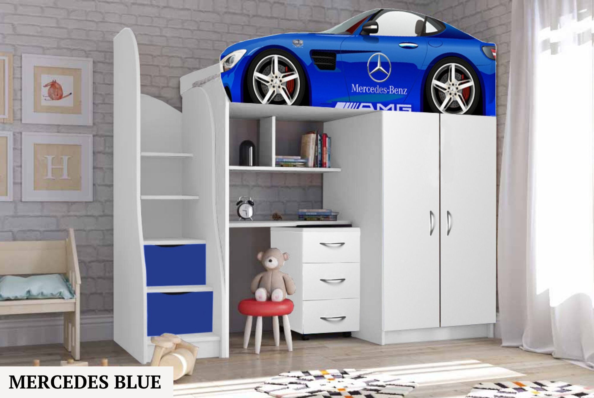 Нижній ярус ліжка складається із шафи, настінних поличок, поличок сходів, виїзного комоду.