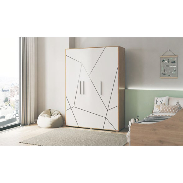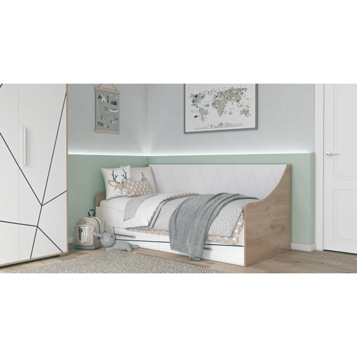 Дитяча Тоні виконана у кольорах Дуб артизан/Німфеа Альба, шовкографія. Корпуси та фасади виготовлені з ДСП товщиною 1,6 см. Матеріал бильця ліжка – біла еко шкіра.