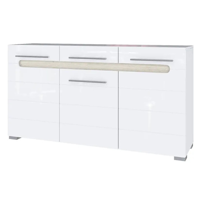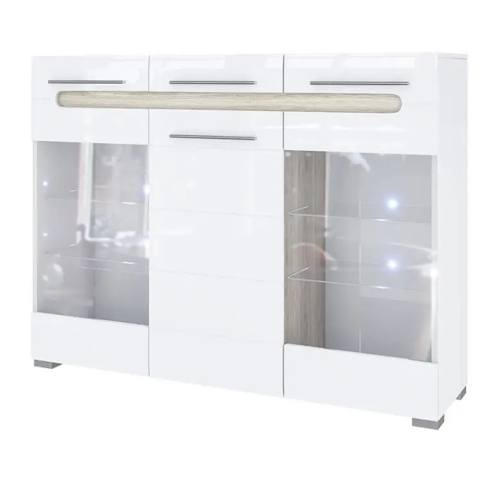 Вітальня Б'янко виконана у кольорах Білий/Білий глянець/Дуб сонома. Корпуси і вставки виготовлені з ДСП товщиною 1,6 см, фасади - з МДФ.