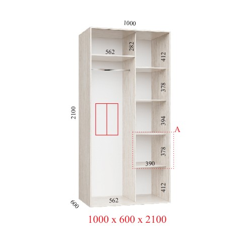 Этот шкаф имеет стандартные для корпусного шкафа-купе элементы: верх, дно, боковые стены и заднюю стенку. Также содержит в себе внутреннюю стойку, которая разделяет шкаф на секцию с полками и секцию с 1-й штангой для тремпелей («плечиков» для одежды). Изготовлен из ламинированной ДСП плиты толщиной 16 мм, все внешние срезы покрыты кромкой, внутренние элементы также окромкованы. Задняя стенка изготовлена из ДВП. Раздвижная система имеет алюминиевый профиль. Каждая сторона двери-фасада оснащена уплотнителем, который предотвращает запыление и загрязнение внутренней части шкафа. Двери оборудованы роликами с анти-скачковыми механизмами, фиксация двери в нужном месте осуществляется специальным стопором. Шкаф такого типа отлично поможет вам сохранять свои вещи в порядке и чистоте.