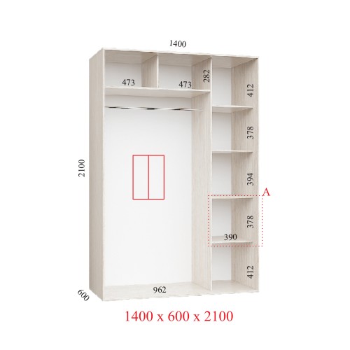 Этот шкаф имеет стандартные для корпусного шкафа-купе элементы: верх, дно, боковые стены и заднюю стенку. Также содержит в себе внутреннюю стойку, которая разделяет шкаф на секцию с полками и секцию с 1-й штангой для тремпелей («плечиков» для одежды). Изготовлен из ламинированной ДСП плиты толщиной 16 мм, все внешние срезы покрыты кромкой, внутренние элементы также окромкованы. Задняя стенка изготовлена из ДВП. Раздвижная система имеет алюминиевый профиль. Каждая сторона двери-фасада оснащена уплотнителем, который предотвращает запыление и загрязнение внутренней части шкафа. Двери оборудованы роликами с анти-скачковыми механизмами, фиксация двери в нужном месте осуществляется специальным стопором. Шкаф такого типа отлично поможет вам сохранять свои вещи в порядке и чистоте.