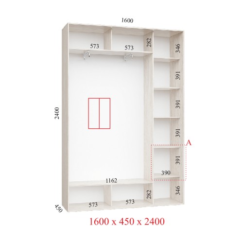 Этот шкаф имеет стандартные для корпусного шкафа-купе элементы: верх, дно, боковые стены и заднюю стенку. Также содержит в себе внутреннюю стойку, которая разделяет шкаф на секцию с полками и секцию с 2-мя микролифтами для тремпелей («плечиков» для одежды). Изготовлен из ламинированной ДСП плиты толщиной 16 мм, все внешние срезы покрыты кромкой, внутренние элементы также окромкованы. Задняя стенка изготовлена из ДВП. Раздвижная система имеет алюминиевый профиль. Каждая сторона двери-фасада оснащена уплотнителем, который предотвращает запыление и загрязнение внутренней части шкафа. Двери оборудованы роликами с анти-скачковыми механизмами, фиксация двери в нужном месте осуществляется специальным стопором. Шкаф такого типа отлично поможет вам сохранять свои вещи в порядке и чистоте.