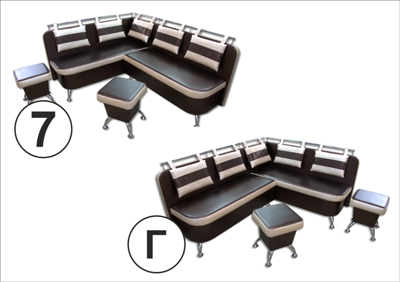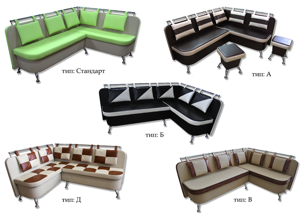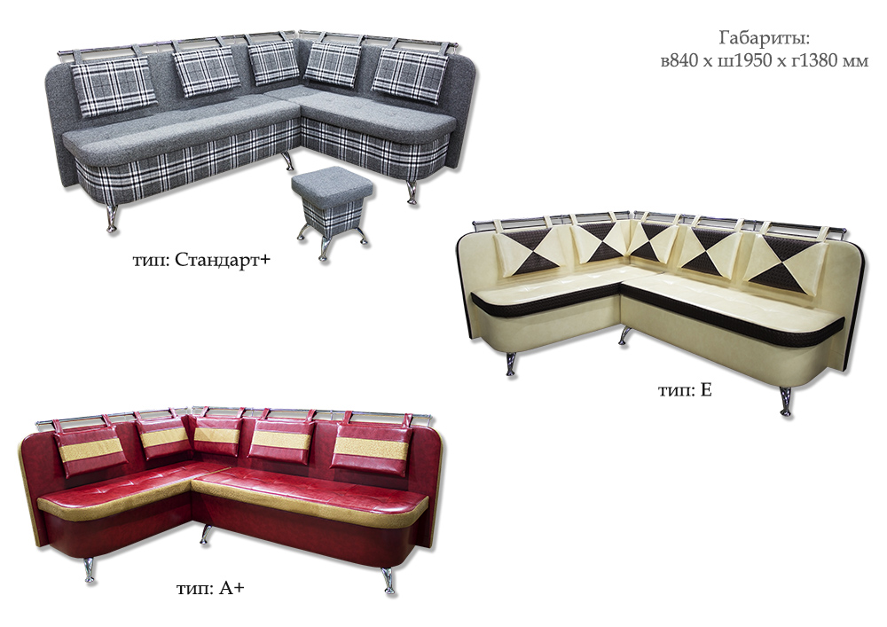 Купить кухонный уголок Модерн Кухонный уголок Модерн идеально подходит для кухонь и столовых.Удобный уголок выполнена в качественном кожзаме. Имеется ряд цветов, которые можно подобрать практически для любого интерьера. Под сидениеми есть вместительные ниши. Вы также можете приобрести кухонные лавки Модерн и банкетки, которые выполнены в одном стиле. Уголок имеет несколько типов, которые отличаются нанесением обивки: Стандарт, Стандарт+, А, А+, Б, В, Д, Е (обозначения указаны на фото № 7-8). Приставка '+' обозначает, что модель та же, но выполняется с утяжками на сидениях, что обеспечивает долговечность и прочность сидения. Характеристики: Комплект: Кухонный угол + 2 банкетки Наполнитель:Пенополиуритан. Материал:кожзам. Габаритные размеры:в840 х ш1950 х д1380 х г600 мм. Ниша:Есть. Модель изготовлена из экологически чистых материалов. Сертификаты и гигиенические выводы предоставляем по требованию. Гарантия на мебель- 18 месяцев. Возможно изготовление в индивидуальных размерах.