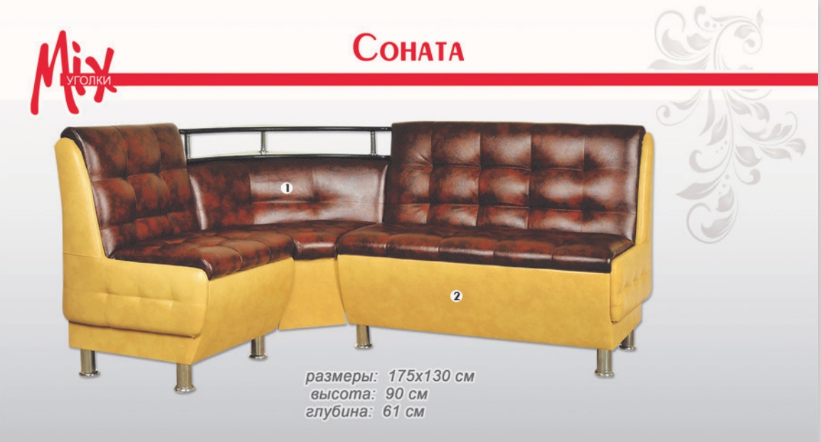 Данный уголок оснащен коробом для хранения вещей и красивой функциональной полочкой, которая послужит подставкой к чему-либо или будет местом для разных мелочей. Фабрика предлагает широкий выбор материалов и цветовой гаммы. Мягкие сиденья уголка кухонного выполнены из эластичного пенополиуритана, обладающего повышенной прочностью. Каркас угла «Соната» выполнен из ДСП, который противостоит механическим повреждениям в бытовых условиях, с применением бруса. Может быть как нераскладной так и раскладной.