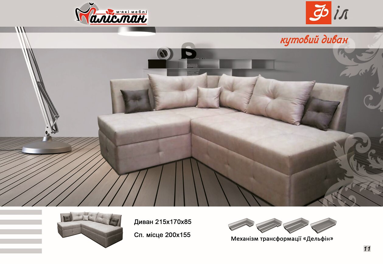Угловой диван 215х170х85см, спальное место 200х155см, механизм трансформации 'Дельфин'.
