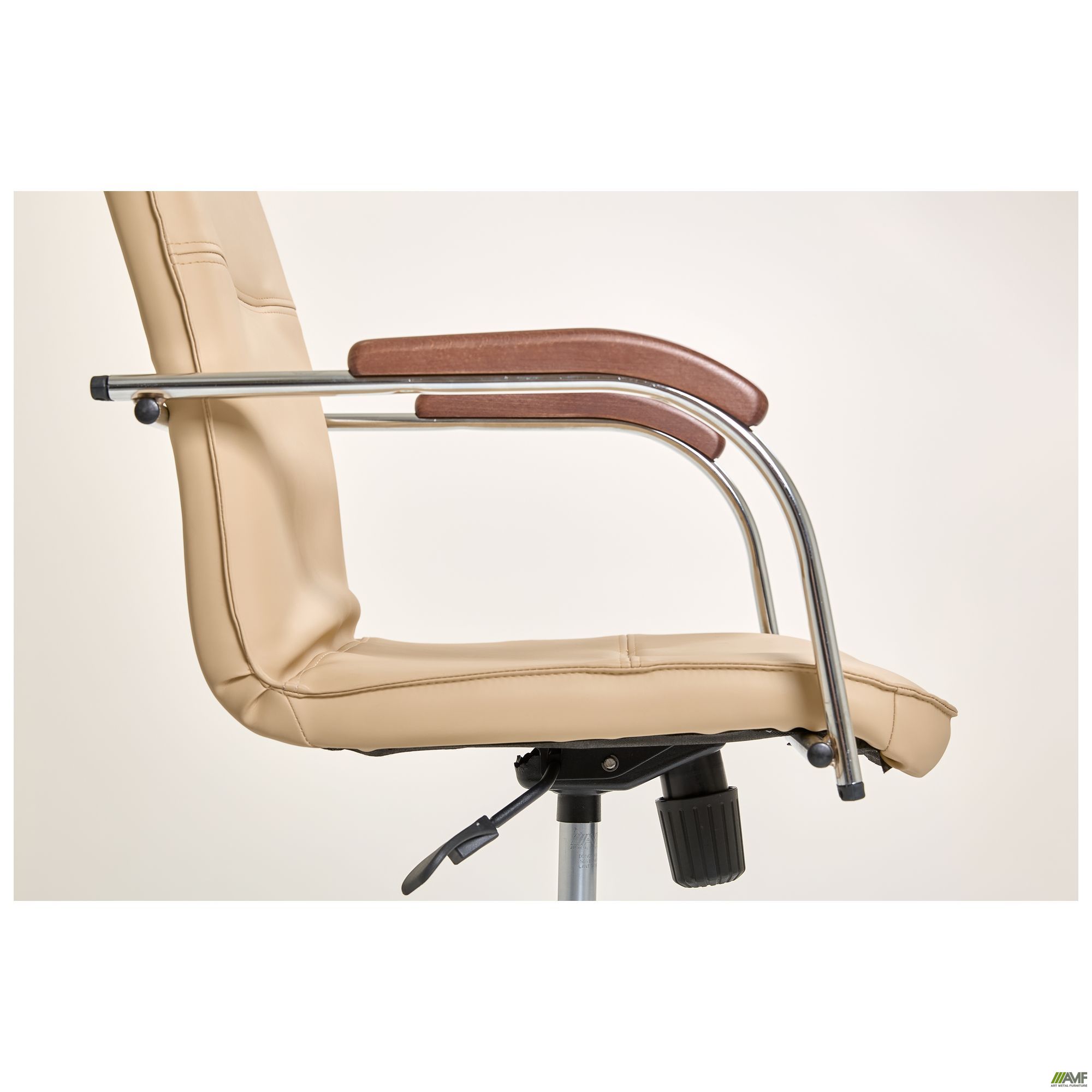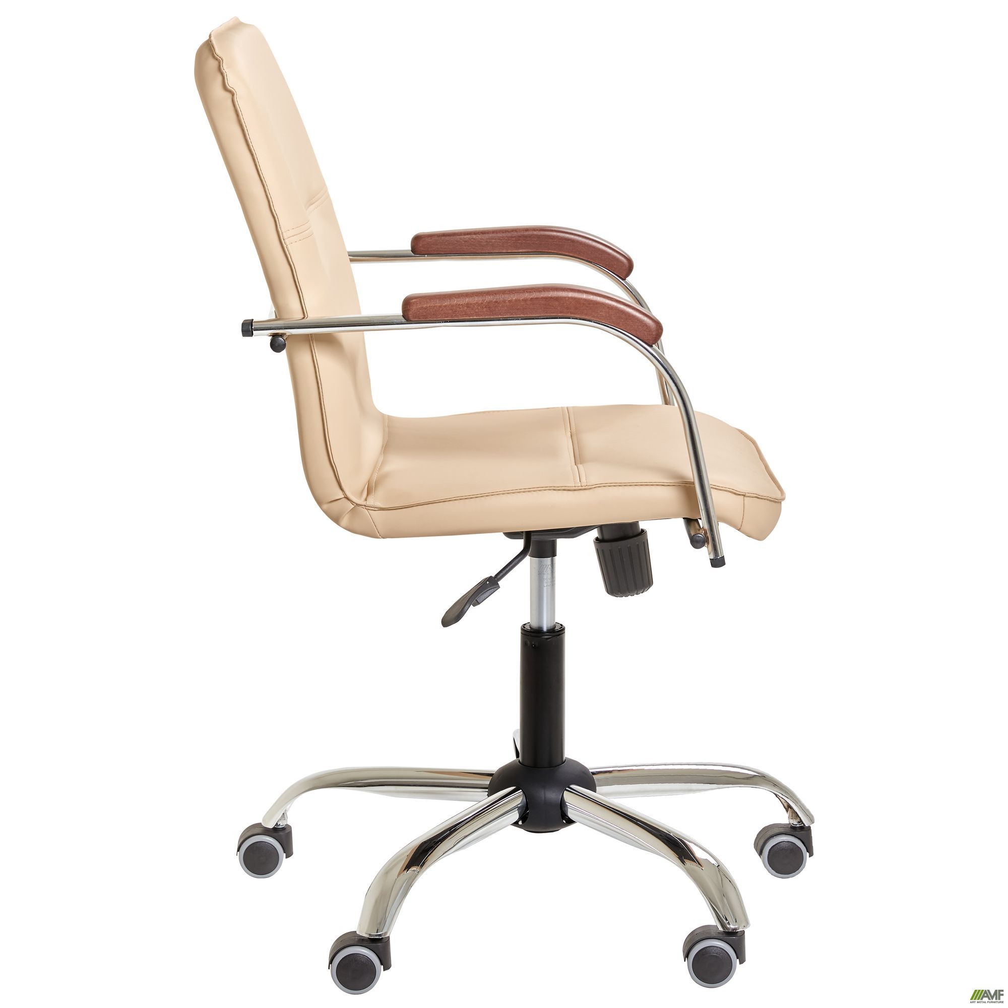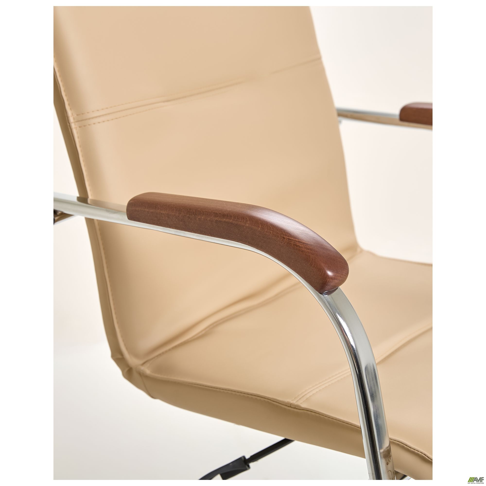 Данная модификация кресла Самба изготавливается без канта, на роликах, из каркаса цвета хром, с деревянными подлокотниками из массива бука.