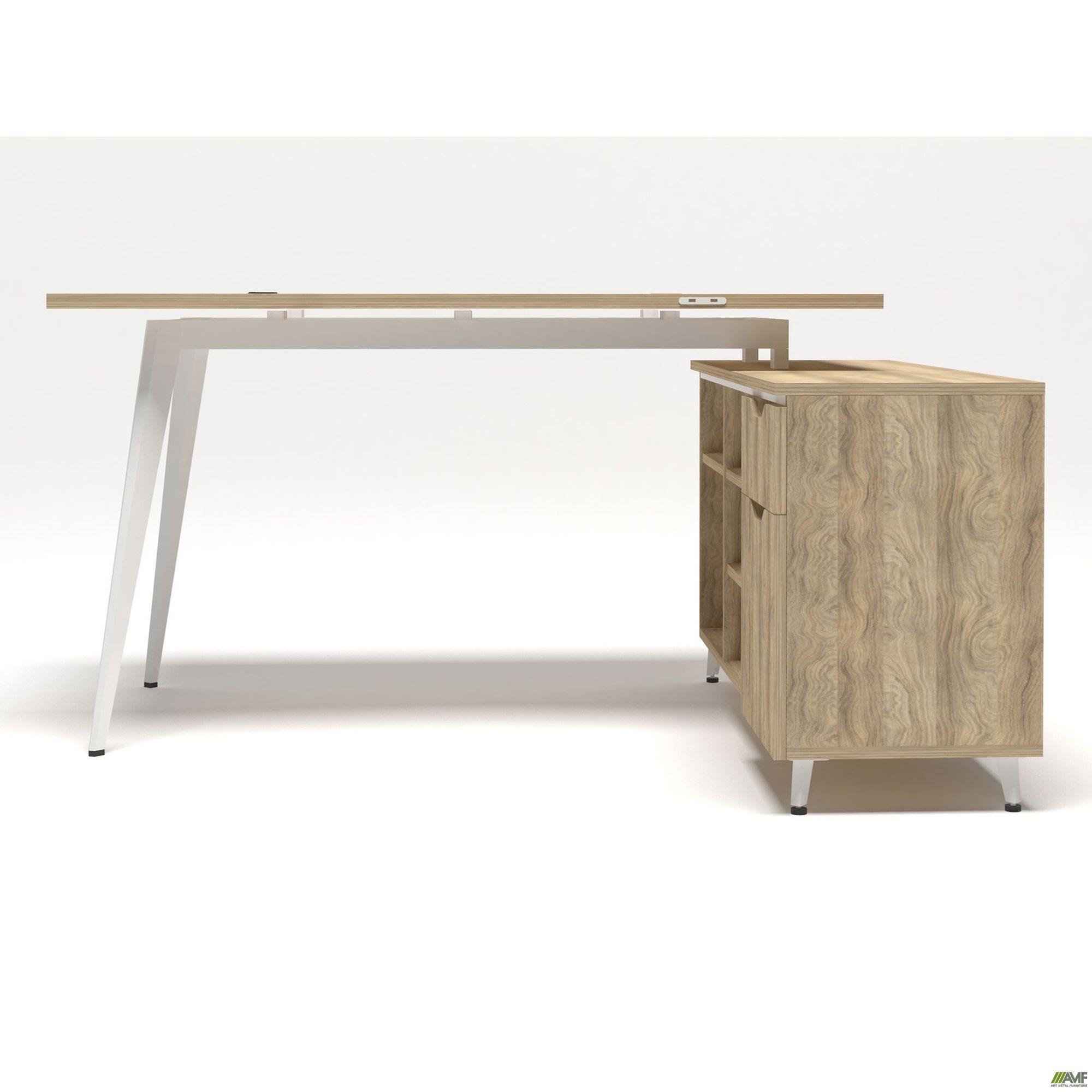 Дельта – это современная и стильная линейка созданная для нестандартных офисных пространств. Для того чтобы оборудовать стильные зоны за счет неординарных элементов в данной линейке используются навесные системы и модули позволяющие делать различные комбинации. Особенностью линейки Дельта является гармоничное повторение трапециевидных вырезов на ручках тумб, шкафов и навесных элементов. Линейка представлена в дизайнерском цвете Блеквуд ячменный.